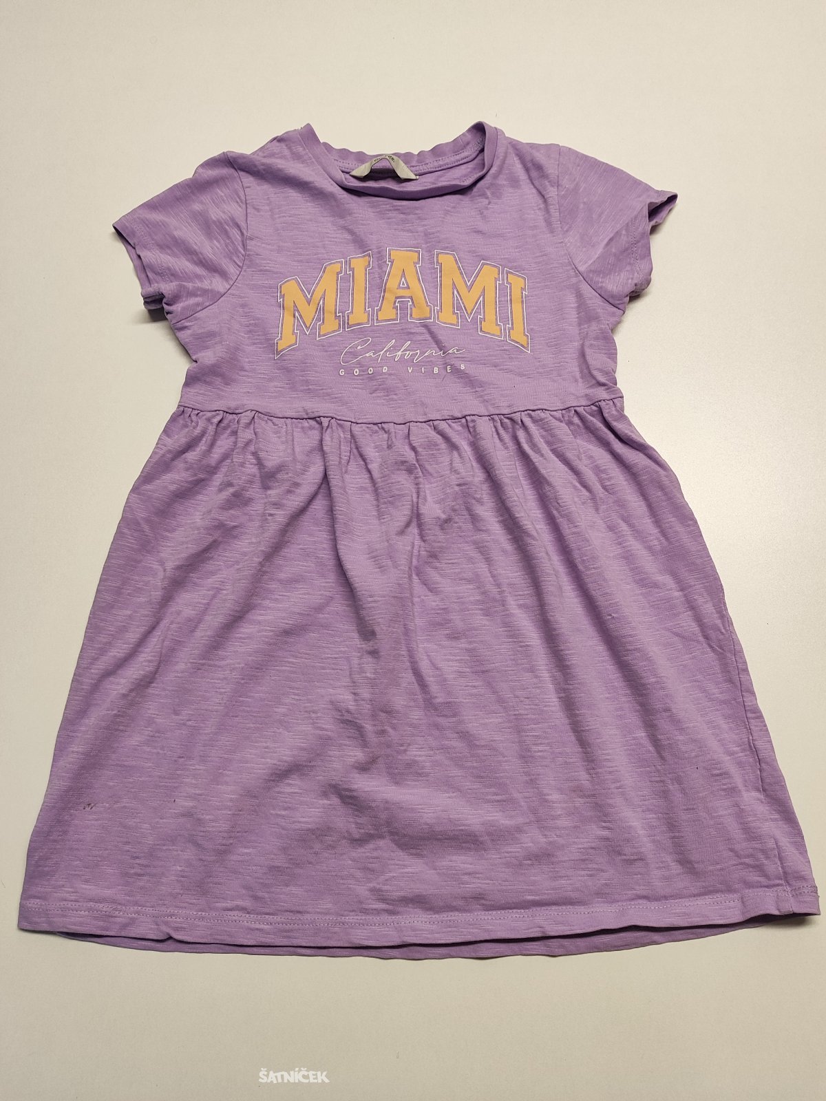 Fialové šaty s nápisem kr. rukáv secondhand, vel. 116/122